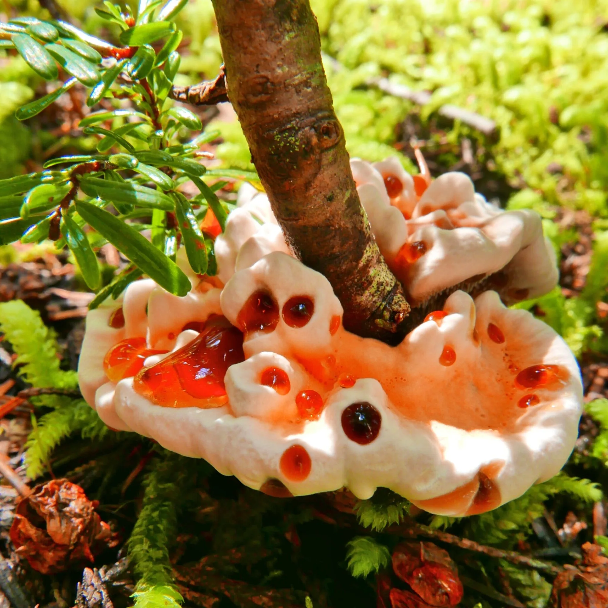 The orange tooth fungus, captured by Steve exuding vivid red guttation droplets — a phenomenon where the fungus secretes excess moisture through its pores. These striking jewel-like droplets make young specimens one of the most photogenic finds in Pacific Northwest forests. Steve's DNA sequencing work has helped identify several new species in this genus.
